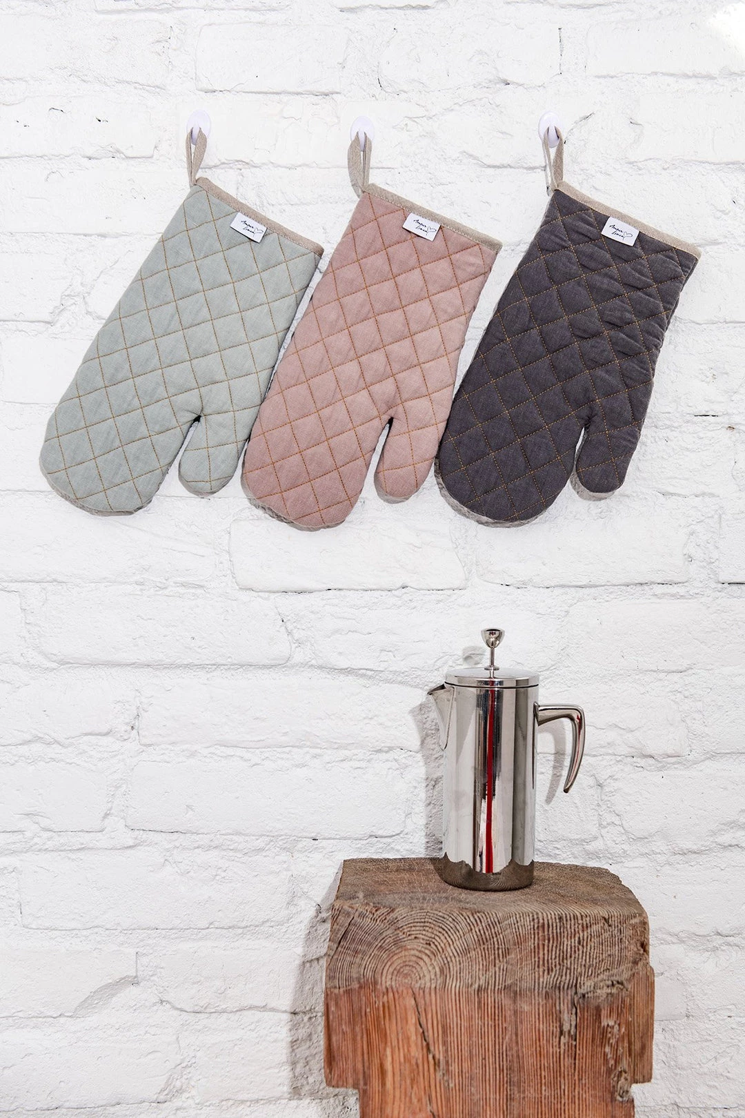 Linen oven mitt with heat-resistant padding.A beautiful and useful addition to the kitchen. These linen oven mitts warp up any space with their farmhouse charm. A high-quality oven mitt will give the kitchen a relaxed yet sophisticated look. A minimalist, one-color with gold stitching due to its pastel color palette offers a rustic laid-back style. All our neutral colors that will easily blend in with your home decor and will look stylish.