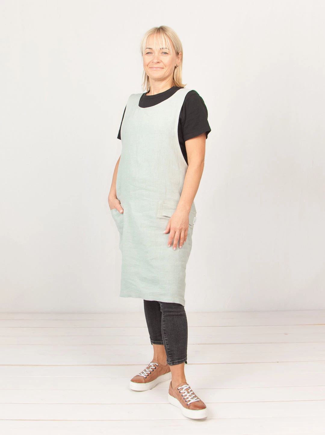 Beautiful, minimalist, and practical aprons can be only one – The Pinafone linen apron. Keep your clothes neat and clean effortlessly while you comfortably carry on with your jobs. A full-length apron inspired by the traditional pinafone apron style but enhanced with simplicity and modernism. While it takes the shape of a summer dress it is super lightweight and comes in a selection of sizes to choose from, so you can just glide around like you don’t even wear an apron. Comes with shoulder straps and cross-back construction, no need to worry about hooks, loops, or tie back.