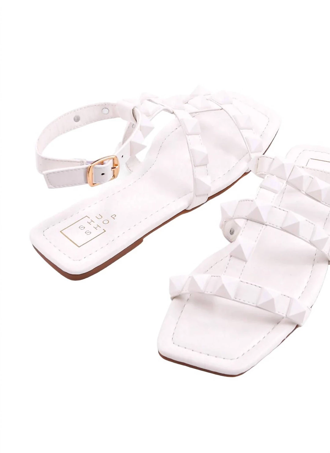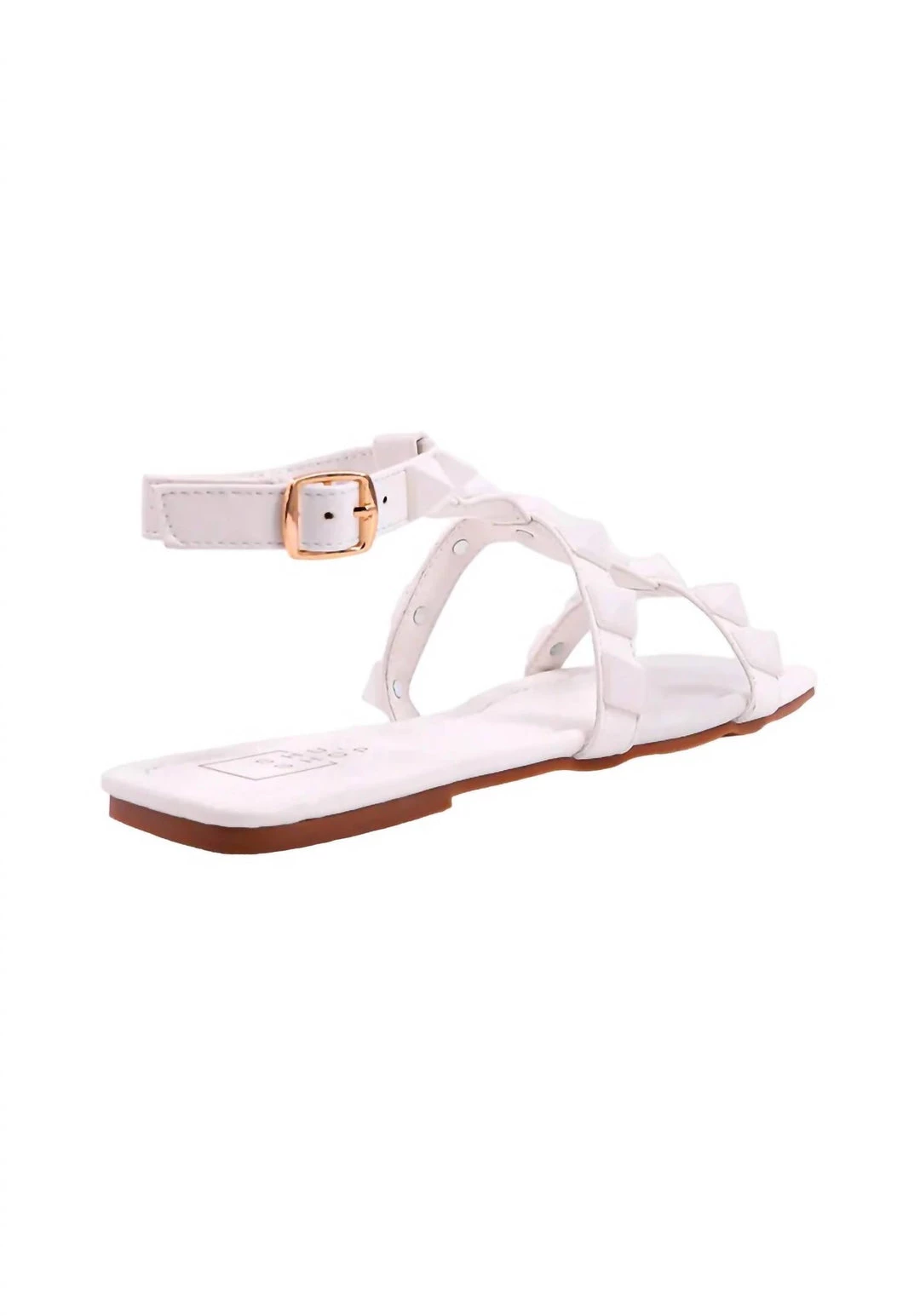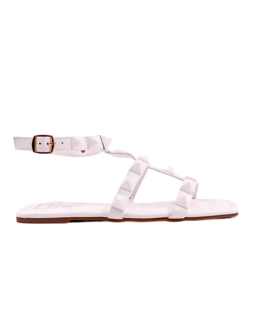 Studded flat sandal is crafted from supple faux leather and decorated with matching color pyramid-shaped embellishments along the straps.