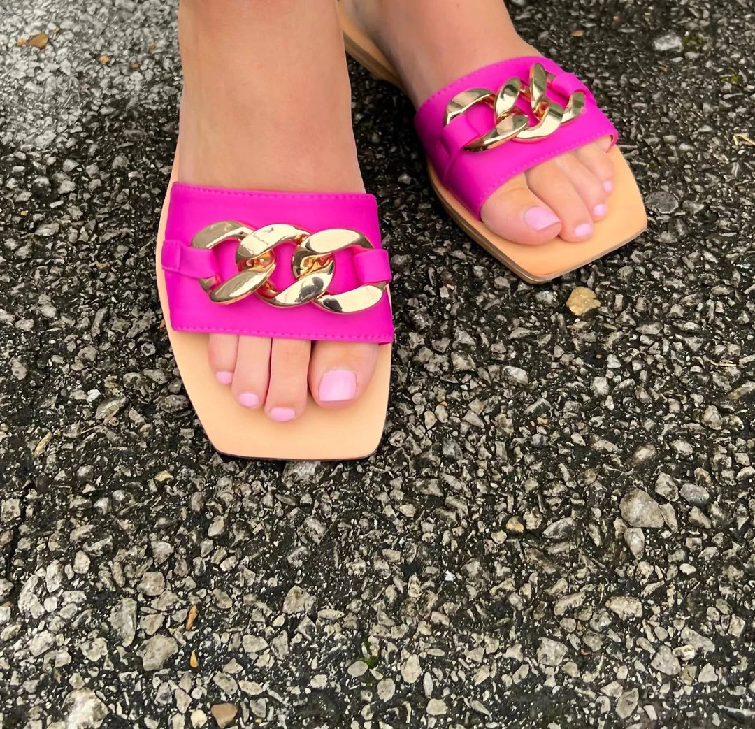 Features a single strap topped with a lightweight chain and eye-catching ’90s-inspired squared toes.